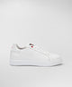 SNEAKER IN PELLE CON LOGO GOFFRATO Sneaker in pelle con lacci e logo laterale goffrato. La scarpa total white è brandizzata sulla linguetta e sul tallone in contrasto colore. Punta tonda suola a cassetta in gomma fodera interna in bambù traspirante e anello per stringa rosso. Un evergreen senza tempo da indossare con ogni outfit. Logo laterale in rilievo in tono colore Punta stondata Pelle