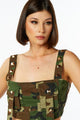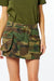 Gonnina cargo mimetica con tasconi laterali. Bottoni oro stud. Disponibile anche in verde foresta tinta unita. Composizione: 100% Cotone.