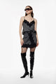 Gonna lunga dalla linea asimmetrica caratterizzata da un sofisticato bordo in pizzo applicato lungo l’orlo e a mezza altezza. Il taglio fluido e la vita alta permettono molteplici interpretazioni stilistiche valorizzando una silhouette contemporanea per chi ricerca originalità e ricercatezza nel guardaroba metropolitano.